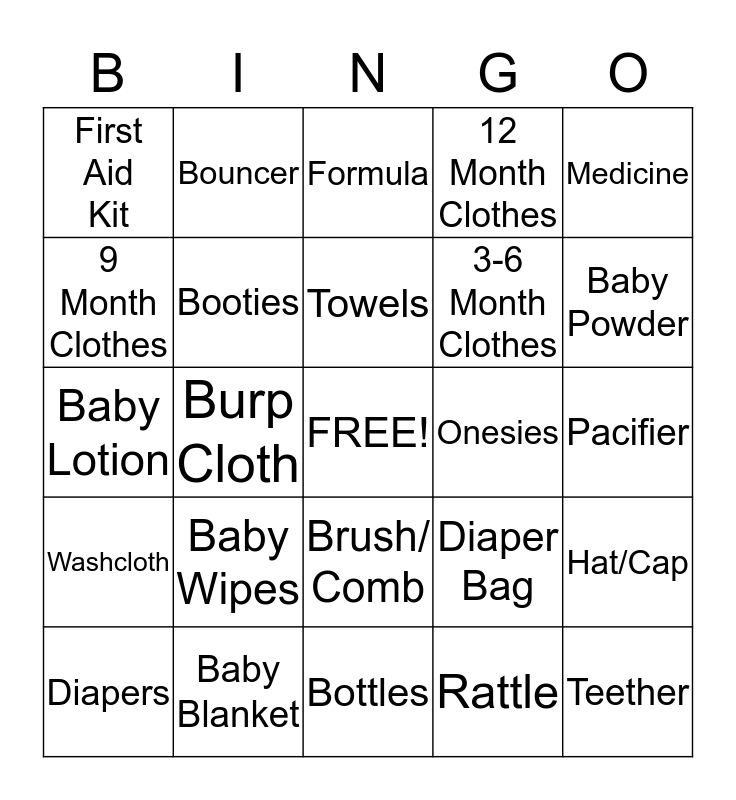 This bingo card has a free space and 29 words: Diapers, Bibs, Burp Cloth, Ointment, First Aid Kit, Formula, Booties, Baby Wipes, Onesies, Baby Blanket, Pacifier, Teether, Bottles, Rattle, Baby Powder, Baby Shampoo, Brush/ Comb, Washcloth, Medicine, Baby Lotion, Diaper Bag, Newborn Clothes, 3-6 Month Clothes, 9 Month Clothes, 12 Month Clothes, Bouncer, Hat/Cap, Towels and Sheets.