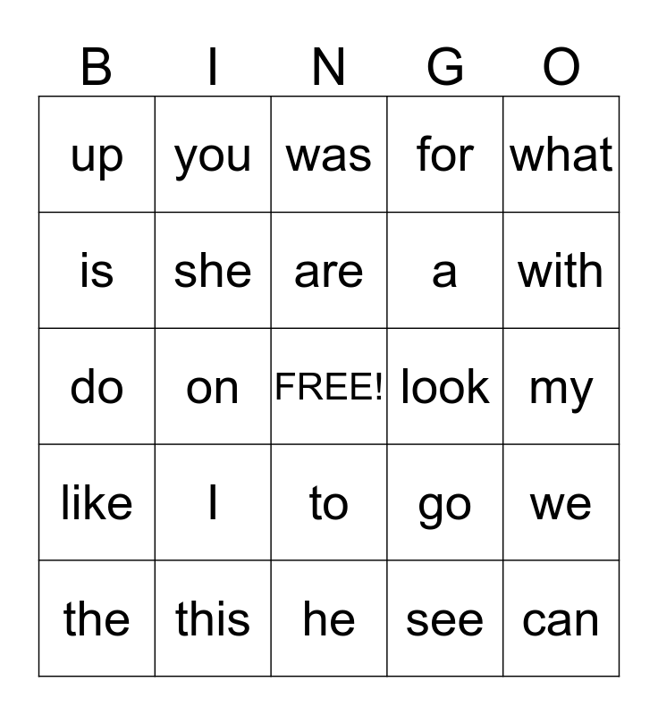 This bingo card has a free space and 30 words: this, in, on, has, up, was, she, to, look, he, my, can, see, have, with, said, go, like, I, what, do, and, you, a, is, for, we, the, are and by.