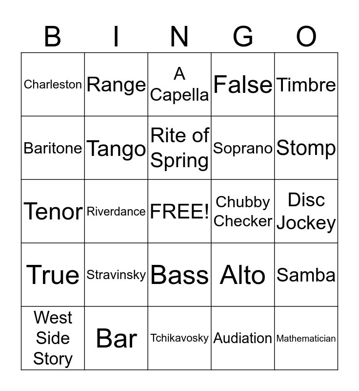 This bingo card has a free space and 24 words: Stravinsky, Bar, Rite of Spring, West Side Story, Timbre, Charleston, Baritone, Range, Chubby Checker, Bass, Soprano, Tenor, Alto, Samba, Tango, Audiation, Disc Jockey, A Capella, Stomp, Riverdance, Mathematician, True, False and Tchikavosky.