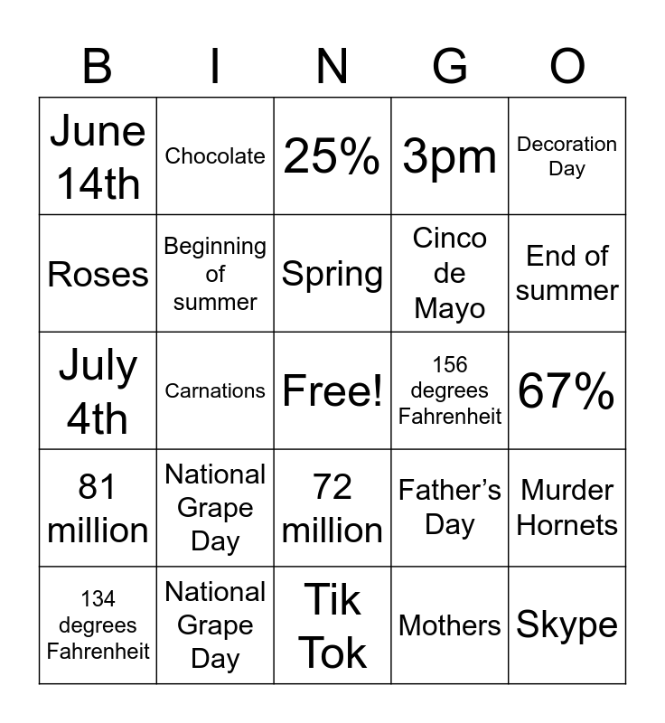 This bingo card has a free space and 50 words: Toilet Paper, Skype, Quarantine Haircut Fails, Tik Tok, National Grape Day, Veterans Day, Chocolate, Zoom, Roses, May, Beginning of summer, 3pm, Murder Hornets, Father’s Day, 97%, Battle of Puebla, Spring, 156 degrees Fahrenheit, Social Distancing, Decoration Day, Carnations, Mothers, June 14th, Cinco de Mayo, 69, National Flip Flop Day, End of summer, Large gatherings, 25%, 72 million, Theodore Roosevelt, Battle of La Mesa, Summer Solstice, World War I, National Grape Day, Woodrow Wilson, Cicadas, Tik Tok, 46, 67%, Tiger King, Quarantine Haircut Fails, 11am, Civil War, 134 degrees Fahrenheit, July 4th, Skype, National Olive Day, 81 million and Toilet Paper.