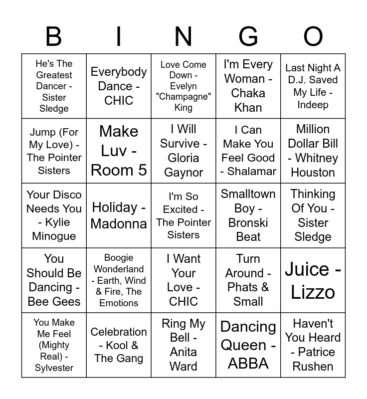 This bingo card has 25 words: Boogie Wonderland - Earth, Wind & Fire, The Emotions, Ring My Bell - Anita Ward, I Will Survive - Gloria Gaynor, You Make Me Feel (Mighty Real) - Sylvester, Last Night A D.J. Saved My Life - Indeep, He's The Greatest Dancer - Sister Sledge, Jump (For My Love) - The Pointer Sisters, Everybody Dance - CHIC, Smalltown Boy - Bronski Beat, I Want Your Love - CHIC, I Can Make You Feel Good - Shalamar, Your Disco Needs You - Kylie Minogue, Turn Around - Phats & Small, Juice - Lizzo, Make Luv - Room 5, Haven't You Heard - Patrice Rushen, Thinking Of You - Sister Sledge, Love Come Down - Evelyn "Champagne" King, Million Dollar Bill - Whitney Houston, Holiday - Madonna, I'm So Excited - The Pointer Sisters, Celebration - Kool & The Gang, You Should Be Dancing - Bee Gees, I'm Every Woman - Chaka Khan and Dancing Queen - ABBA.