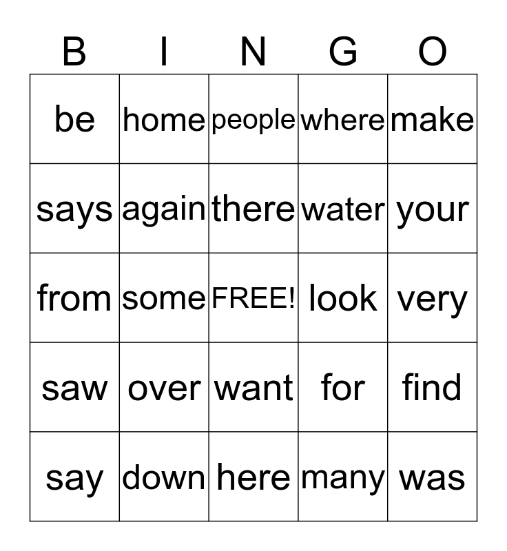 This bingo card has a free space and 24 words: over, down, there, say, make, be, says, home, look, want, water, from, for, find, again, many, very, people, your, some, was, saw, where and here.