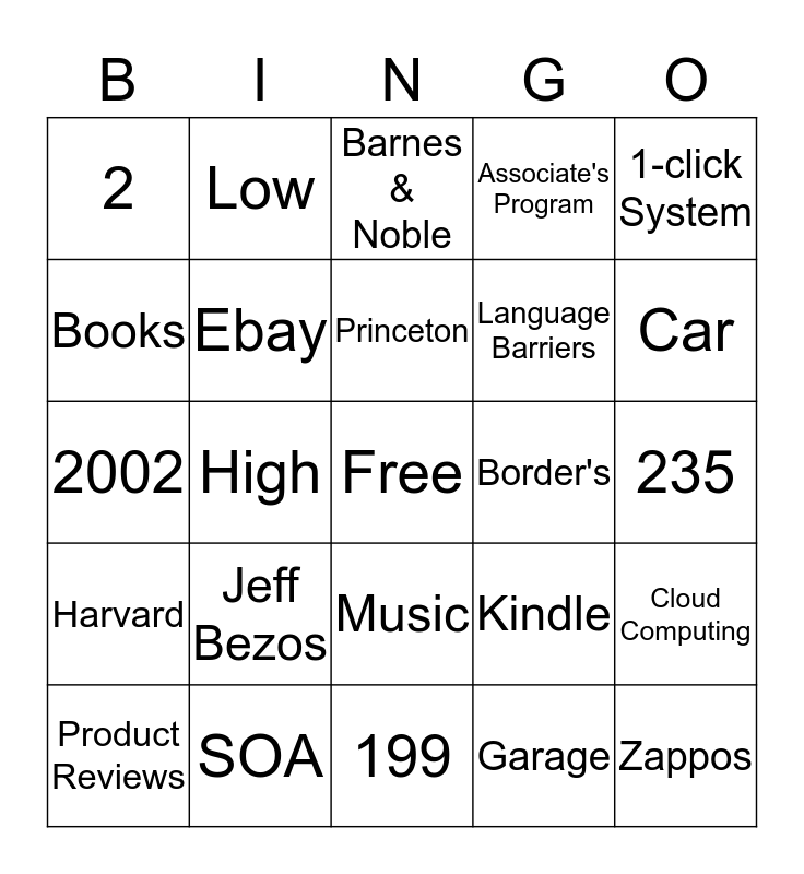 This bingo card has a free space and 24 words: Jeff Bezos, SOA, Princeton, Product Reviews, 1-click System, 2, Books, Low, Border's, Music, Language Barriers, 2002, Kindle, Cloud Computing, Ebay, Garage, 235, Barnes & Noble, Car, High, Zappos, Harvard, Associate's Program and 199.