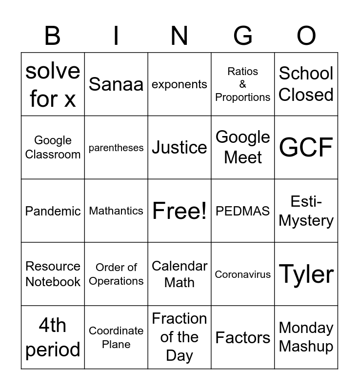 This bingo card has a free space and 29 words: 4th period, C6, Mathantics, Freckle Math, solve for x, exponents, parentheses, Order of Operations, PEDMAS, Coordinate Plane, Esti-Mystery, Monday Mashup, Fraction of the Day, Factors, GCF, LCM, Calendar Math, Resource Notebook, School Closed, Pandemic, Coronavirus, Remote Learning, Google Meet, Google Classroom, Ratios & Proportions, Sanaa, Tyler, Justice and Brady.