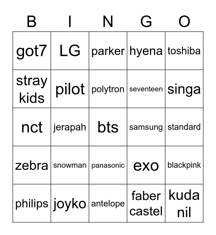 This bingo card has a free space and 24 words: snowman, joyko, polytron, philips, toshiba, got7, stray kids, LG, samsung, panasonic, seventeen, nct, exo, blackpink, pilot, faber castel, standard, parker, singa, jerapah, kuda nil, zebra, hyena and antelope.