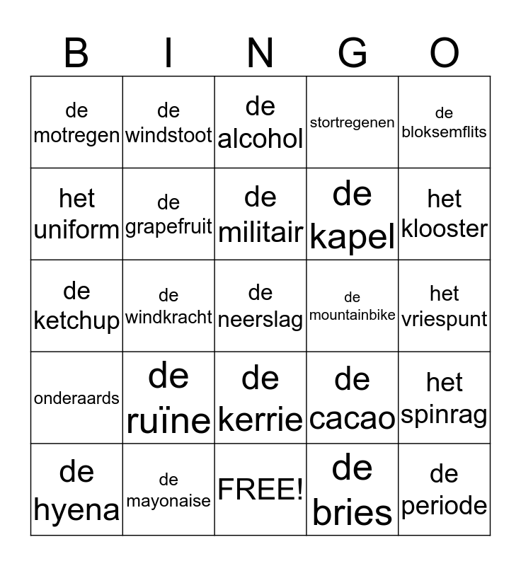 This bingo card has 31 words: FREE!, de mosterd, de windkracht, de opklaring, de motregen, de alcohol, de grapefruit, de cacao, de mountainbike, de bries, het vriespunt, de neerslag, de periode, de generaal, het klooster, de juwelen, het spinrag, de ruïne, onderaards, de kerrie, de bloksemflits, het kadaver, de hyena, de windstoot, de kapel, het uniform, stortregenen, de ketchup, de mayonaise, de militair and de ingewanden.