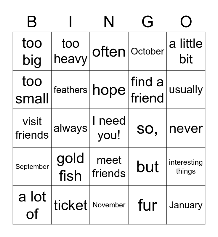 This bingo card has a free space and 24 words: gold fish, ticket, hope, a lot of, a little bit, too big, too small, too heavy, so,, meet friends, find a friend, visit friends, but, interesting things, feathers, fur, never, often, usually, always, January, September, October and November.