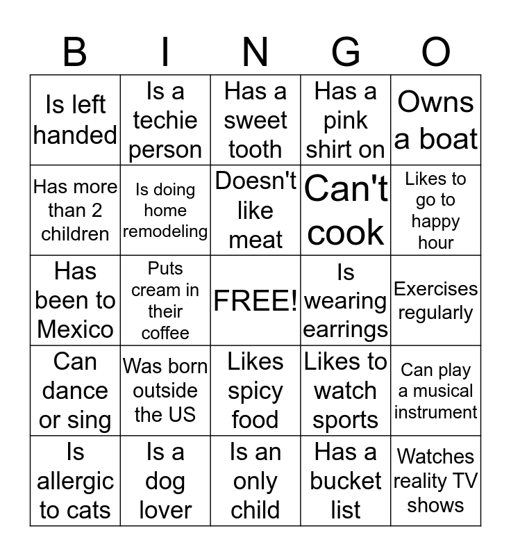 This bingo card has a free space and 24 words: Was born outside the US, Is a dog lover, Doesn't like meat, Is allergic to cats, Owns a boat, Is left handed, Has more than 2 children, Is a techie person, Is wearing earrings, Likes spicy food, Can't cook, Has been to Mexico, Likes to watch sports, Can play a musical instrument, Is doing home remodeling, Has a bucket list, Exercises regularly, Has a sweet tooth, Likes to go to happy hour, Puts cream in their coffee, Watches reality TV shows, Can dance or sing, Has a pink shirt on and Is an only child.