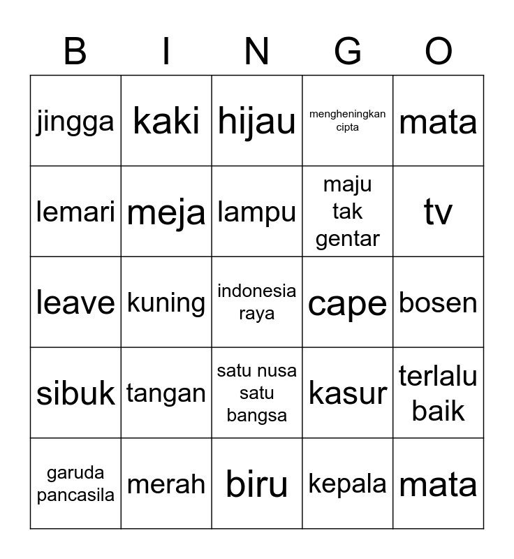 This bingo card has a free space and 24 words: tangan, merah, lampu, garuda pancasila, mata, jingga, lemari, kaki, cape, satu nusa satu bangsa, maju tak gentar, leave, kasur, terlalu baik, meja, kepala, bosen, hijau, tv, kuning, mata, sibuk, mengheningkan cipta and biru.
