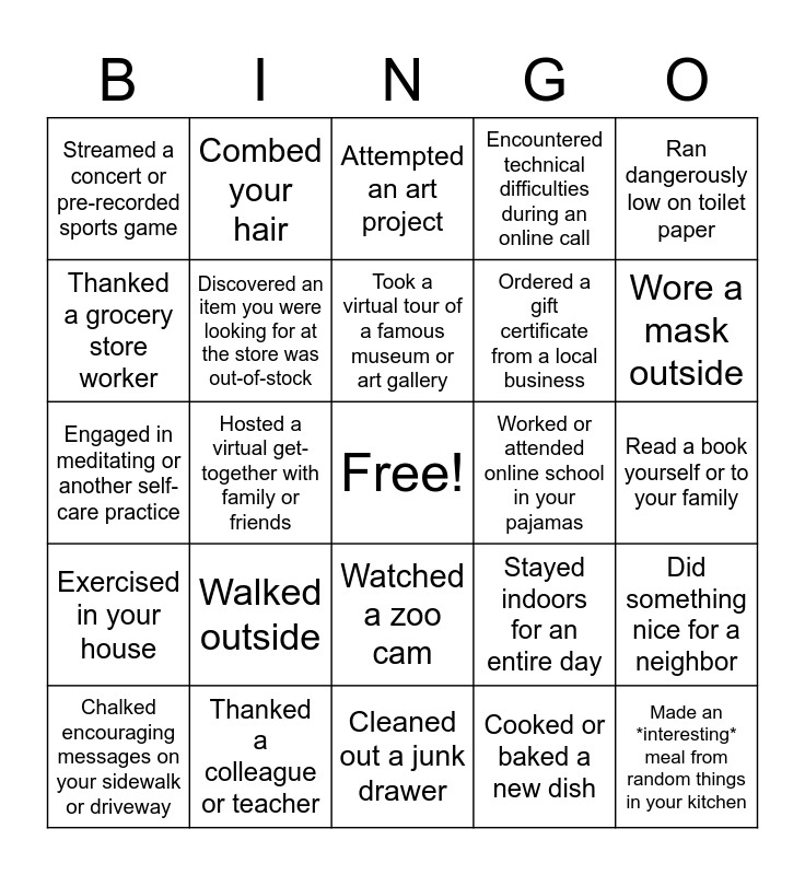 This bingo card has a free space and 29 words: Chalked encouraging messages on your sidewalk or driveway, Ordered takeout or delivery from a local restaurant, Hosted a virtual get-together with family or friends, Called a friend or acquaintance you haven't spoken to in a while, Streamed a concert or pre-recorded sports game, Attempted an art project, Discovered an item you were looking for at the store was out-of-stock, Walked outside, Worked or attended online school in your pajamas, Thanked a colleague or teacher, Read a book yourself or to your family, Made an *interesting* meal from random things in your kitchen, Cleaned out a junk drawer, Cooked or baked a new dish, Wore a mask outside, Watched a new movie or TV show, Watched a zoo cam, Exercised in your house, Ran dangerously low on toilet paper, Engaged in meditating or another self-care practice, Stayed indoors for an entire day, Asked "Can you hear / see me?" on an online call, Ordered a gift certificate from a local business, Thanked a grocery store worker, Encountered technical difficulties during an online call, Combed your hair, Did something nice for a neighbor, Took a virtual tour of a famous museum or art gallery and Washed your hands for 20 seconds.