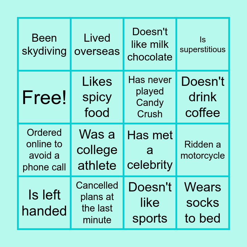This bingo card has 16 words: Cancelled plans at the last minute, Ridden a motorcycle, Doesn't like milk chocolate, Been skydiving, Ordered online to avoid a phone call, Lived overseas, Has met a celebrity, Doesn't like sports, Free!, Likes spicy food, Is left handed, Is superstitious, Was a college athlete, Doesn't drink coffee, Has never played Candy Crush and Wears socks to bed.