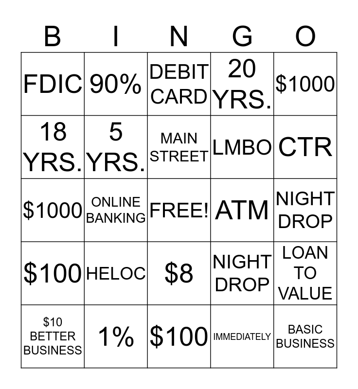 This bingo card has a free space and 46 words: BETTER BUSINESS, BASIC BUSINESS, $8, $100, HELOC, $10,000, 90%, HETL, 18 YRS., 1%, 5 YRS., 20 YRS., LOAN TO VALUE, NIGHT DROP, GIFT CARD, BASIC CONSUMER, MAIN STREET, ATM, DEBIT CARD, $1000, ONLINE BANKING, IMMEDIATELY, FDIC, LMBO, $5, CTR, $10 BETTER BUSINESS, BASIC BUSINESS, $8, $100, HELOC, $10,000, 90%, HETL, 18 YRS., 1%, NIGHT DROP, GIFT CARD, BASIC CONSUMER, MAIN STREET, ATM, DEBIT CARD, $1000, ONLINE BANKING, IMMEDIATELY and VISA PLATNIUM PLUS.