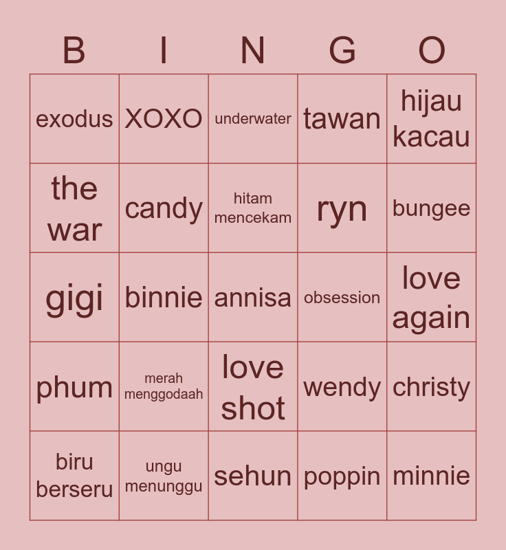 This bingo card has a free space and 24 words: merah menggodaah, ungu menunggu, hitam mencekam, biru berseru, hijau kacau, exodus, the war, XOXO, obsession, love shot, ryn, gigi, wendy, christy, candy, poppin, love again, underwater, bungee, binnie, minnie, phum, tawan and sehun.