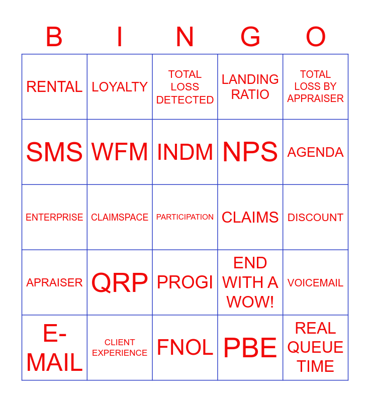 This bingo card has a free space and 24 words: QRP, CLIENT EXPERIENCE, INDM, E-MAIL, TOTAL LOSS BY APPRAISER, RENTAL, SMS, LOYALTY, CLAIMS, PROGI, NPS, ENTERPRISE, END WITH A WOW!, VOICEMAIL, WFM, PBE, DISCOUNT, TOTAL LOSS DETECTED, AGENDA, CLAIMSPACE, REAL QUEUE TIME, APRAISER, LANDING RATIO and FNOL.