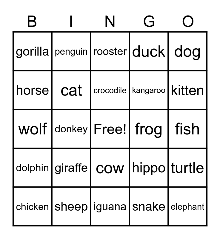 This bingo card has a free space and 39 words: bat, bear, Bird, cat, chicken, cow, crocodile, dog, dog, dolphin, donkey, duck, elephant, fish, frog, giraffe, goat, gorilla, hen, hippo, horse, iguana, kangaroo, kitten, lion, monkey, mouse, panda, parrot, penguin, puppy, rabbit, rooster, sheep, snake, tiger, turtle, wolf and zebra.