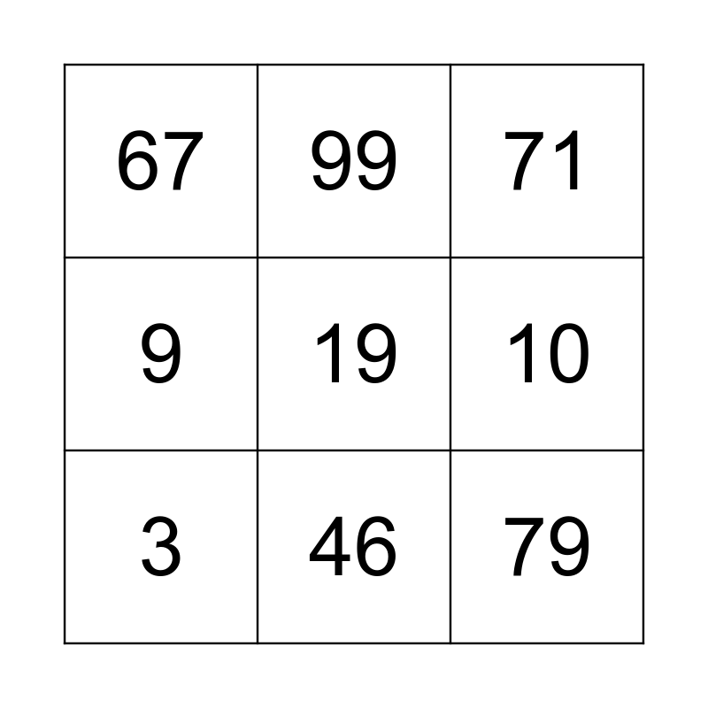 This bingo card has 9 words: 3, 71, 99, 9, 67, 10, 19, 79 and 46.