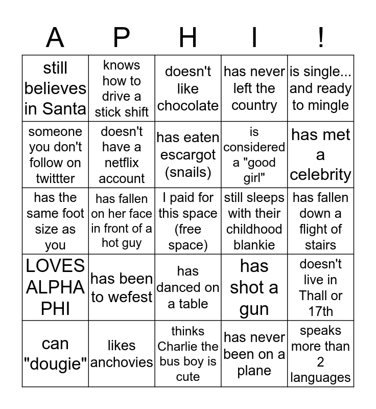 This bingo card has a free space and 24 words: has been to wefest, likes anchovies, has eaten escargot (snails), can "dougie", is single... and ready to mingle, still believes in Santa, someone you don't follow on twittter, knows how to drive a stick shift, still sleeps with their childhood blankie, has danced on a table, is considered a "good girl", has the same foot size as you, has shot a gun, doesn't live in Thall or 17th, doesn't have a netflix account, has never been on a plane, has fallen down a flight of stairs, doesn't like chocolate, has met a celebrity, has fallen on her face in front of a hot guy, speaks more than 2 languages, LOVES ALPHA PHI, has never left the country and thinks Charlie the bus boy is cute.