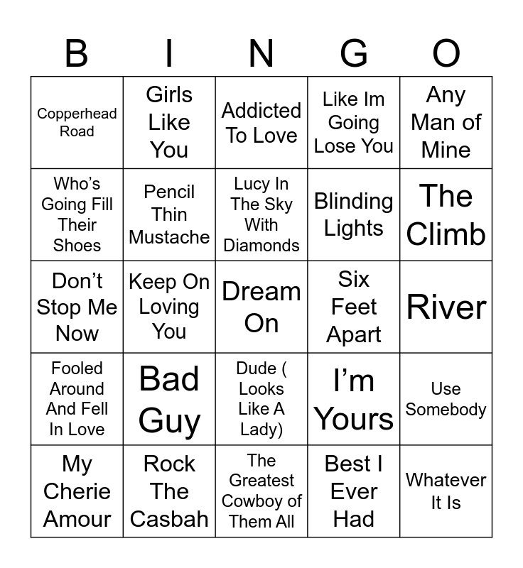 This bingo card has 50 words: Love On The Brain, Dream On, Got To Be Real, The Greatest Cowboy of Them All, Bad Guy, Don’t Stop Till You Get Enough, Girls Like You, Drivin My Life Away, Who’s Going Fill Their Shoes, Longhaired Redneck, Pencil Thin Mustache, Like Im Going Lose You, Use Somebody, I’m Yours, You Found Me, Glad You Came, Lucy In The Sky With Diamonds, Six Feet Apart, Islands In The Stream, Any Man of Mine, Keep On Loving You, Best I Ever Had, Copperhead Road, Blinding Lights, Empire State of Mind, Whatever It Is, The Climb, Country Boy, Addicted To Love, Dude ( Looks Like A Lady), Brass In Pocket, Here I Go Again, Fight For Your Right, Stand, Rock The Casbah, Your Going Miss This, Drunk Last Night, Almost Home, Sparks, River, Simple Man, Voodoo Child, Slip Away, The Cover of ARolling Stone, My Cherie Amour, Don’t Stop Me Now, I Want You Back, Sharing The Night Together, Fooled Around And Fell In Love and River.