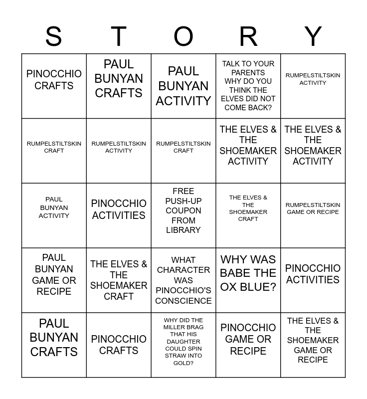 ⚠ This card has duplicate items: RUMPELSTILTSKIN CRAFT (2), PAUL BUNYAN CRAFTS (2), THE ELVES & THE SHOEMAKER ACTIVITY (2), PINOCCHIO ACTIVITIES (2)