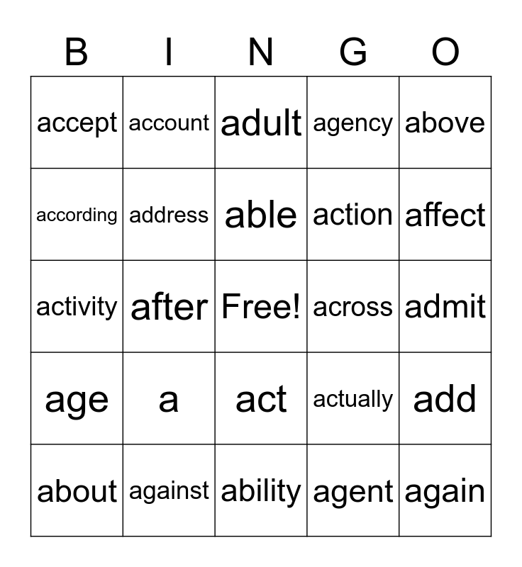 This bingo card has a free space and 25 words: a, ability, able, about, above, accept, according, account, across, act, action, activity, actually, add, address, administration, admit, adult, affect, after, again, against, age, agency and agent.