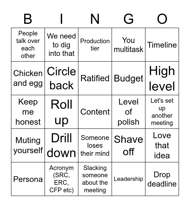 This bingo card has a free space and 24 words: Drill down, Acronym (SRC, ERC, CFP etc), Ratified, Persona, Timeline, People talk over each other, Chicken and egg, We need to dig into that, Level of polish, Someone loses their mind, Budget, Keep me honest, Shave off, Love that idea, Circle back, Leadership, Let's set up another meeting, Production tier, High level, Roll up, Drop deadline, Muting yourself, You multitask and Slacking someone about the meeting.