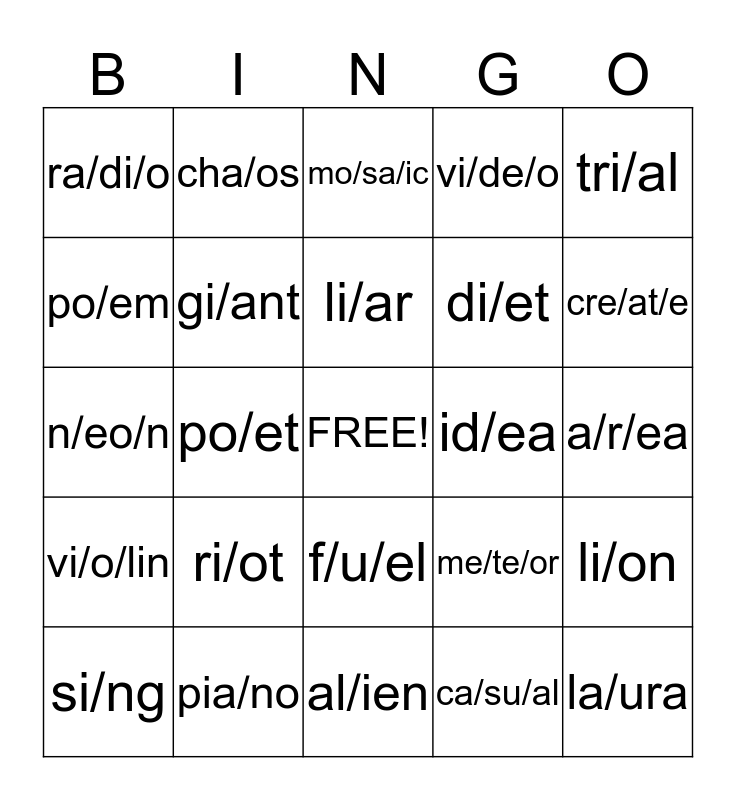 This bingo card has a free space and 24 words: ri/ot, pia/no, li/ar, si/ng, tri/al, ra/di/o, po/em, cha/os, id/ea, f/u/el, di/et, n/eo/n, me/te/or, li/on, gi/ant, ca/su/al, a/r/ea, mo/sa/ic, cre/at/e, po/et, la/ura, vi/o/lin, vi/de/o and al/ien.