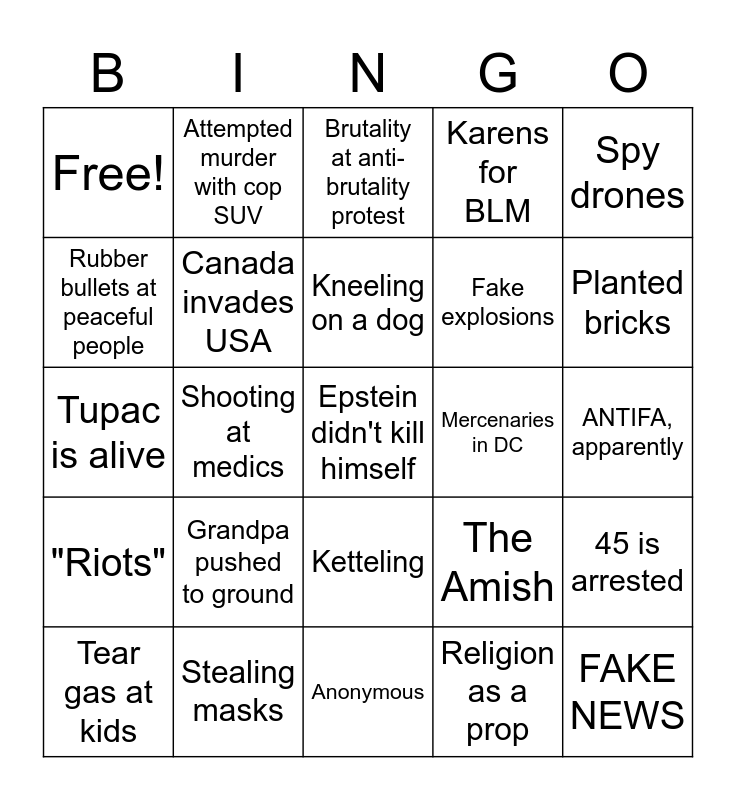 This bingo card has a free space and 24 words: Grandpa pushed to ground, Stealing masks, Kneeling on a dog, Tear gas at kids, Spy drones, Free!, Rubber bullets at peaceful people, Attempted murder with cop SUV, Mercenaries in DC, Ketteling, Fake explosions, Tupac is alive, The Amish, 45 is arrested, Canada invades USA, Religion as a prop, ANTIFA, apparently, Brutality at anti-brutality protest, Planted bricks, Shooting at medics, FAKE NEWS, "Riots", Karens for BLM and Anonymous.