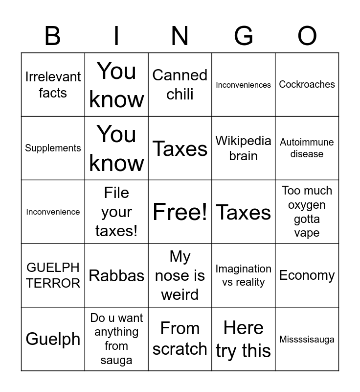 This bingo card has a free space and 24 words: Rabbas, Do u want anything from sauga, Taxes, Guelph, Cockroaches, Irrelevant facts, Supplements, You know, Taxes, My nose is weird, Wikipedia brain, Inconvenience, Imagination vs reality, Economy, You know, Here try this, Too much oxygen gotta vape, Canned chili, Autoimmune disease, File your taxes!, Missssisauga, GUELPH TERROR, Inconveniences and From scratch.