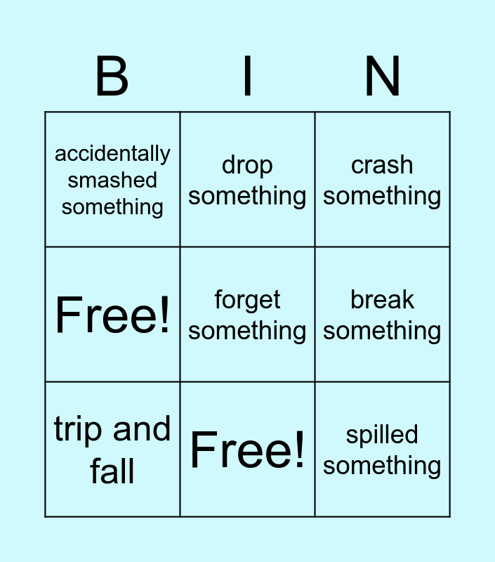 This bingo card has a free space and 8 words: break something, crash something, drop something, trip and fall, accidentally smashed something, spilled something, Free! and Free!.