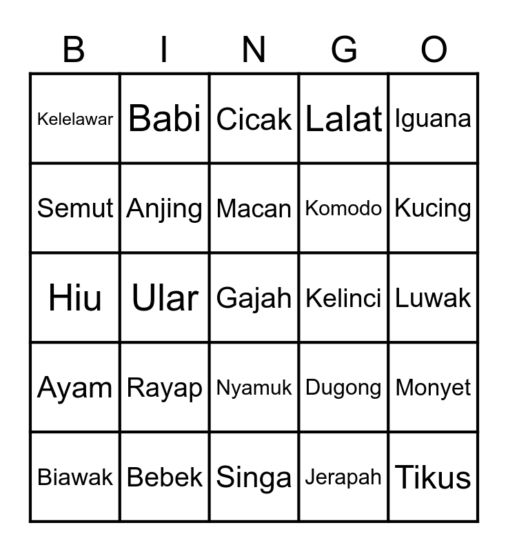 This bingo card has 25 words: Ayam, Bebek, Gajah, Jerapah, Iguana, Kelelawar, Babi, Cicak, Kelinci, Monyet, Semut, Anjing, Singa, Dugong, Kucing, Biawak, Ular, Macan, Komodo, Luwak, Hiu, Rayap, Nyamuk, Lalat and Tikus.