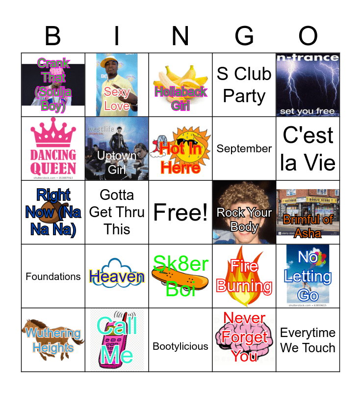 This bingo card has 17 images, a free space and 22 words: Heaven, Call Me, Hot In Herre, Wuthering Heights, Crank That (Soulja Boy), Sexy Love, Rock Your Body, Sk8er Boi, September, Right Now (Na Na Na), Fire Burning, No Letting Go, Uptown Girl, Never Forget You, Brimful of Asha, Hollaback Girl, C'est la Vie, Gotta Get Thru This, Everytime We Touch, Foundations, S Club Party and Bootylicious.