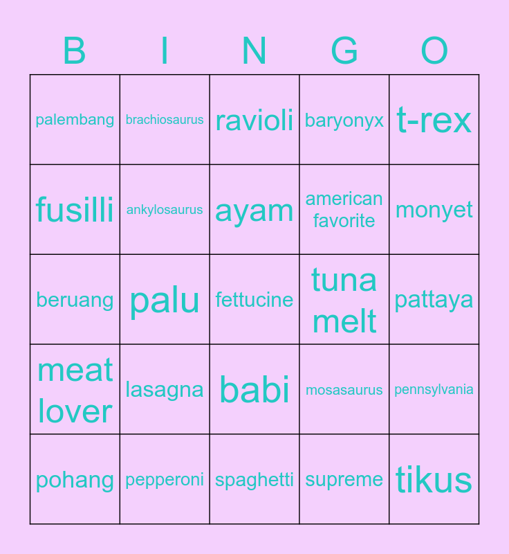 This bingo card has a free space and 24 words: lasagna, pepperoni, ayam, pohang, t-rex, palembang, fusilli, brachiosaurus, tuna melt, babi, american favorite, beruang, mosasaurus, pennsylvania, ankylosaurus, supreme, pattaya, ravioli, monyet, palu, tikus, meat lover, baryonyx and spaghetti.