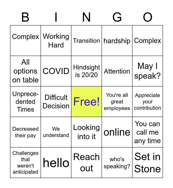 This bingo card has a free space and 24 words: We understand, hello, Hindsight is 20/20, Challenges that weren't anticipated, Complex, Complex, All options on table, Working Hard, You're all great employees, Looking into it, Attention, Unprece-dented Times, online, You can call me any time, COVID, who's speaking?, Appreciate your contribution, Transition, May I speak?, Difficult Decision, Set in Stone, Decreased their pay, hardship and Reach out.