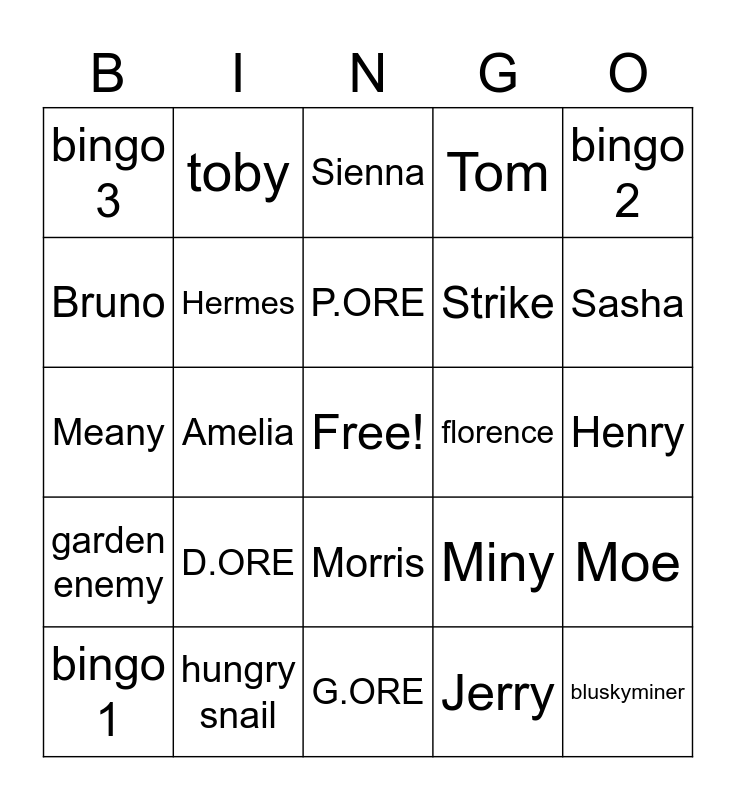 This bingo card has a free space and 25 words: D.ORE, G.ORE, P.ORE, bingo 1, bingo 2, bingo 3, Bruno, toby, florence, Morris, Strike, Meany, Miny, Moe, Hermes, Saturn II, Henry, Sienna, Sasha, Amelia, bluskyminer, hungry snail, garden enemy, Tom and Jerry.