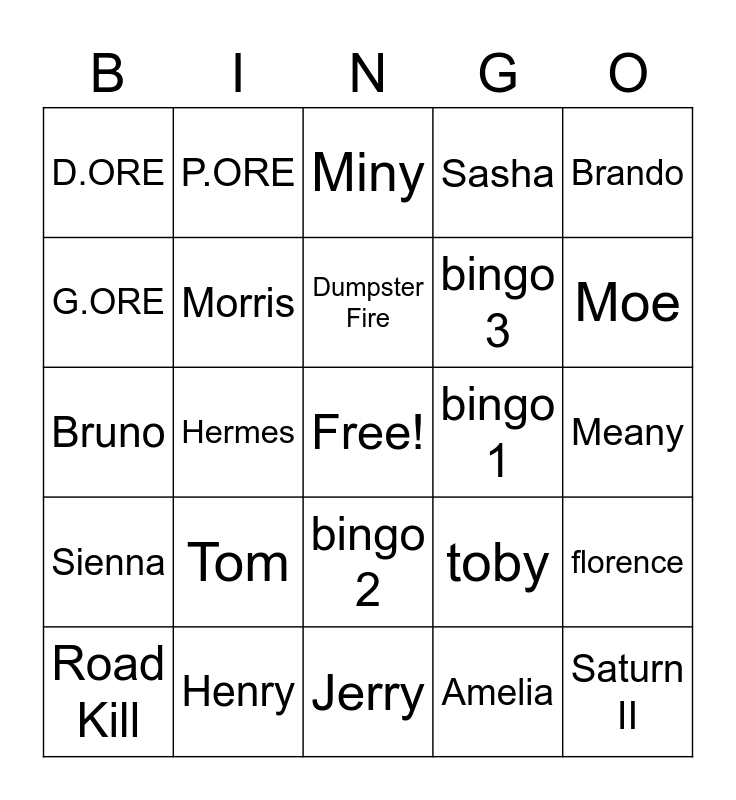 This bingo card has a free space and 25 words: Tom, Jerry, Dumpster Fire, Road Kill, Brando, D.ORE, G.ORE, P.ORE, bingo 1, bingo 2, bingo 3, Bruno, toby, florence, Morris, Strike, Meany, Miny, Moe, Hermes, Saturn II, Henry, Sienna, Sasha and Amelia.
