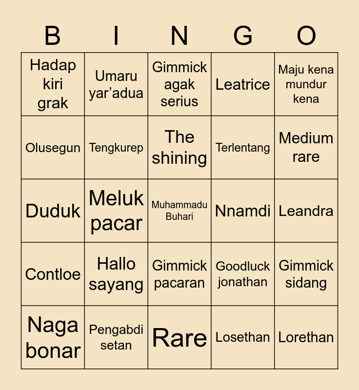 This bingo card has a free space and 24 words: Hallo sayang, Pengabdi setan, The shining, Naga bonar, Maju kena mundur kena, Hadap kiri grak, Olusegun, Umaru yar’adua, Nnamdi, Gimmick pacaran, Terlentang, Duduk, Goodluck jonathan, Gimmick sidang, Tengkurep, Losethan, Leandra, Gimmick agak serius, Medium rare, Meluk pacar, Lorethan, Contloe, Leatrice and Rare.