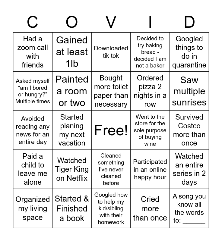 This bingo card has a free space and 24 words: Watched Tiger King on Netflix, Started & Finished a book, Bought more toilet paper than necessary, Organized my living space, Googled things to do in quarantine, Had a zoom call with friends, Asked myself “am I bored or hungry?” Multiple times, Gained at least 1lb, Went to the store for the sole purpose of buying wine, Cleaned something I’ve never cleaned before, Ordered pizza 2 nights in a row, Avoided reading any news for an entire day, Participated in an online happy hour, Watched an entire series in 2 days, Painted a room or two, Cried more than once, Survived Costco more than once, Downloaded tik tok, Saw multiple sunrises, Started planing my next vacation, A song you know all the words to: ______, Paid a child to leave me alone, Decided to try baking bread - decided I am not a baker and Googled how to help my kid/sibling with their homework.