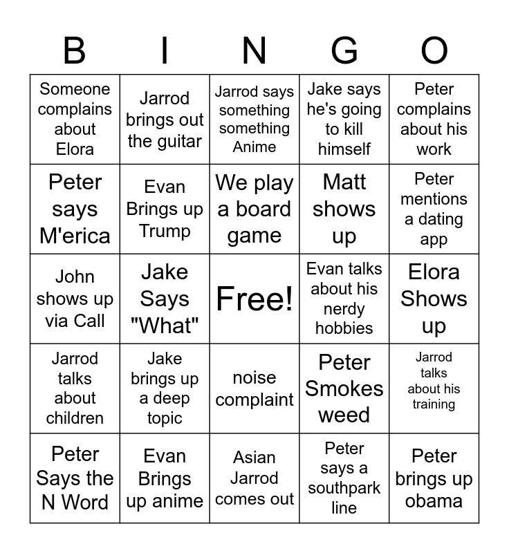 This bingo card has a free space and 24 words: Peter Says the N Word, Jake brings up a deep topic, We play a board game, Peter says a southpark line, Peter complains about his work, Someone complains about Elora, Jarrod brings out the guitar, Jarrod says something something Anime, Evan talks about his nerdy hobbies, Elora Shows up, John shows up via Call, Evan Brings up Trump, Peter Smokes weed, Jarrod talks about his training, Peter says M'erica, Evan Brings up anime, Asian Jarrod comes out, Jake says he's going to kill himself, Peter mentions a dating app, Jarrod talks about children, Jake Says "What", noise complaint, Matt shows up and Peter brings up obama.