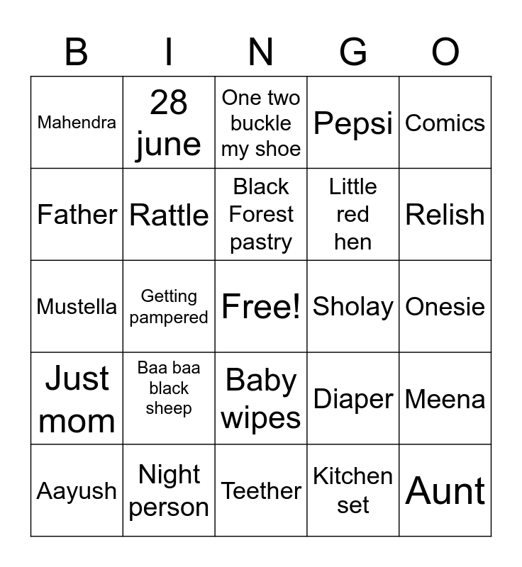 This bingo card has a free space and 24 words: Baa baa black sheep, Night person, Black Forest pastry, Aayush, Comics, Mahendra, Father, 28 june, Sholay, Baby wipes, Little red hen, Mustella, Diaper, Meena, Rattle, Kitchen set, Onesie, One two buckle my shoe, Relish, Getting pampered, Aunt, Just mom, Pepsi and Teether.