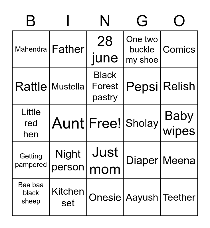 This bingo card has a free space and 24 words: Baa baa black sheep, Night person, Black Forest pastry, Aayush, Comics, Mahendra, Father, 28 june, Sholay, Baby wipes, Little red hen, Mustella, Diaper, Meena, Rattle, Kitchen set, Onesie, One two buckle my shoe, Relish, Getting pampered, Aunt, Just mom, Pepsi and Teether.