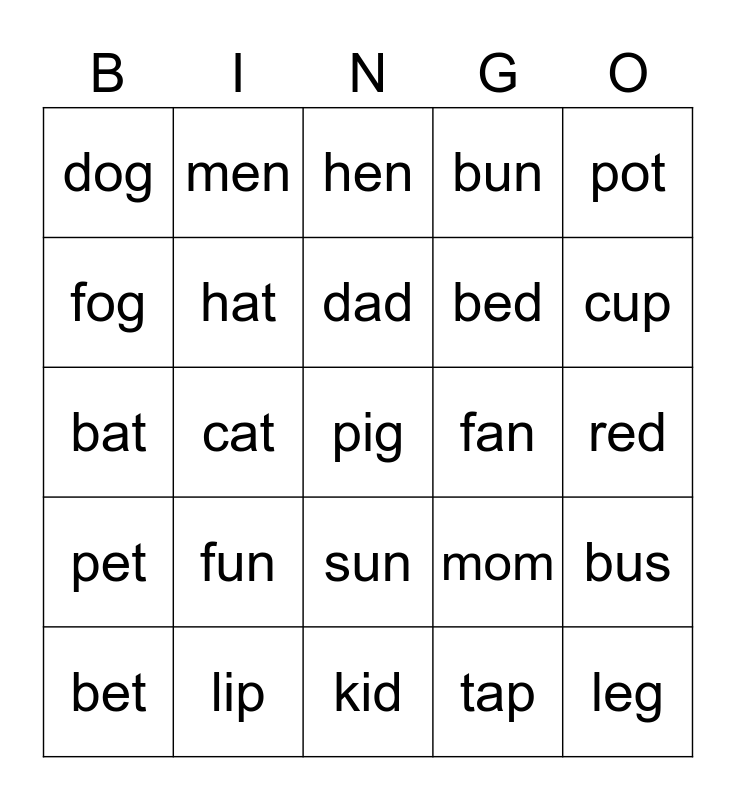 This bingo card has 25 words: pet, lip, pig, tap, pot, dog, men, hen, fan, bus, fog, hat, kid, mom, cup, bet, cat, dad, bed, red, bat, fun, sun, bun and leg.