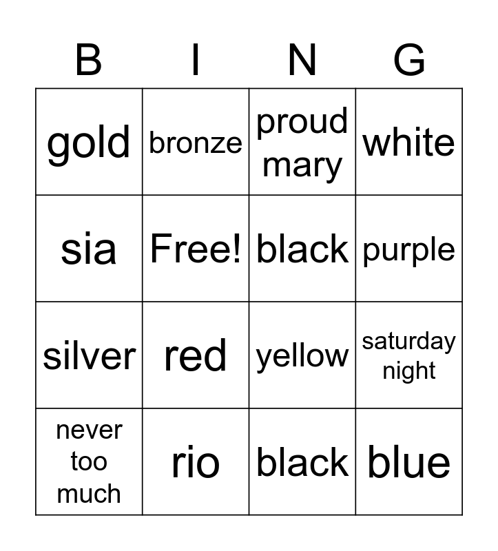 This bingo card has 20 words: saturday night, gotta feling, proud mary, mama mia, never too much, sia, rio, gold, silver, bronze, red, yellow, Free!, blue, black, green, purple, white, black and grey.
