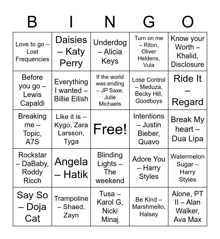 This bingo card has a free space and 53 words: In your eyes – The weekend, Alone, PT II – Alan Walker, Ava Max, Baiana – Bakermat, Be Kind – Marshmello, Halsey, Angela – Hatik, Play Date – Melanie Martinez, Daisies – Katy Perry, Death Bead – Powfu, beabadoobee, Before you go – Lewis Capaldi, Don’t start now – dua Lipa, Everything I wanted – Billie Eilish, Falling – Trevor Daniel, Watermelon Sugar – Harry Styles, Adore You – Harry Styles, Heartbreaker – Loïc Nottet, Say So – Doja Cat, If the world was ending – JP Saxe, Julie Michaels, Intentions – Justin Bieber, Quavo, In Your eyes – Robin Schulz, Alida, Know your Worth – Khalid, Disclosure, Like it is – Kygo, Zara Larsson, Tyga, Little Subarine – The Starlings, Lose Control – Meduza, Becky Hill, Goodboys, Love to go – Lost Frequencies, Mamacita – Black Eyed Peas, Trampoline – Shaed, Zayn, Never seen the rain – Tones and I, Party Girl – StaySolidRocky, Physical – Dua Lipa, Ride It – Regard, Salt – Ava Max, Some Say – Nea, Stop this Flame – Celeste, Stuck with U – Ariana Grande, Justin Bieber, Savage – Megan Thee Stallion, Toosie Slide – Drake, Turn on me – Riton, Oliver Heldens, Vula, Tusa – Karol G, Nicki Minaj, Underdog – Alicia Keys, What a man gotta do – Jonas Brothers, Sunday best – surfaces, Rain on me – Lady Gaga, Ariana Grande, Break My heart – Dua Lipa, Kom wat dichterbij – Regi, Jake Reese, OT, Supalonely – Benee, Gus dapperton, Blinding Lights – The weekend, Roses – Imanbek, Saint Jhn, Ily – Surf Mesa, Emilee, Breaking me – Topic, A7S, Rockstar – DaBaby, Roddy Ricch, Blah Blah Blah – Armin Van Buuren, Weekend – Lizot and Instruction – Jax Jones, Demi Lovato, Stefflon Don.