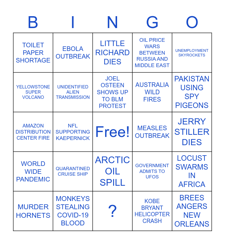 This bingo card has a free space and 24 words: QUARANTINED CRUISE SHIP, MONKEYS STEALING COVID-19 BLOOD, JOEL OSTEEN SHOWS UP TO BLM PROTEST, MURDER HORNETS, UNEMPLOYMENT SKYROCKETS, TOILET PAPER SHORTAGE, YELLOWSTONE SUPER VOLCANO, EBOLA OUTBREAK, MEASLES OUTBREAK, ARCTIC OIL SPILL, AUSTRALIA WILD FIRES, AMAZON DISTRIBUTION CENTER FIRE, GOVERNMENT ADMITS TO UFOS, LOCUST SWARMS IN AFRICA, UNIDENTIFIED ALIEN TRANSMISSION, KOBE BRYANT HELICOPTER CRASH, JERRY STILLER DIES, LITTLE RICHARD DIES, PAKISTAN USING SPY PIGEONS, NFL SUPPORTING KAEPERNICK, BREES ANGERS NEW ORLEANS, WORLD WIDE PANDEMIC, OIL PRICE WARS BETWEEN RUSSIA AND MIDDLE EAST and ?.