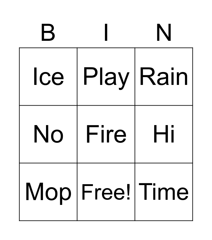 This bingo card has a free space and 8 words: Hi, Rain, Play, Mop, Ice, Time, No and Free!.