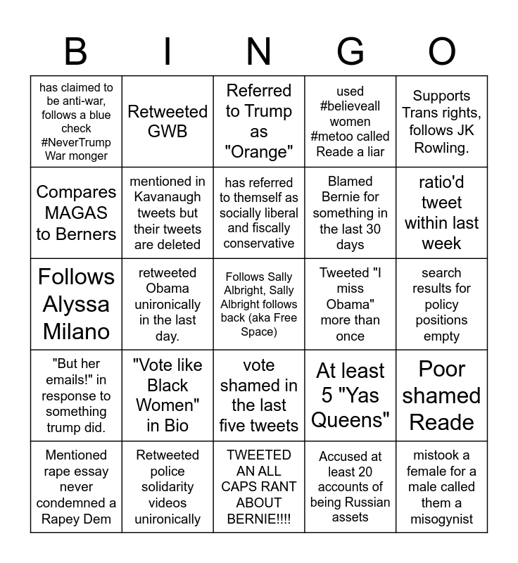 This bingo card has a free space and 24 words: "Vote like Black Women" in Bio, Retweeted police solidarity videos unironically, has referred to themself as socially liberal and fiscally conservative, Mentioned rape essay never condemned a Rapey Dem, Supports Trans rights, follows JK Rowling., has claimed to be anti-war, follows a blue check #NeverTrump War monger, Compares MAGAS to Berners, Retweeted GWB, Tweeted "I miss Obama" more than once, vote shamed in the last five tweets, Blamed Bernie for something in the last 30 days, Follows Alyssa Milano, At least 5 "Yas Queens", Poor shamed Reade, mentioned in Kavanaugh tweets but their tweets are deleted, Accused at least 20 accounts of being Russian assets, search results for policy positions empty, Referred to Trump as "Orange", ratio'd tweet within last week, retweeted Obama unironically in the last day., mistook a female for a male called them a misogynist, "But her emails!" in response to something trump did., used #believeall women #metoo called Reade a liar and TWEETED AN ALL CAPS RANT ABOUT BERNIE!!!!.