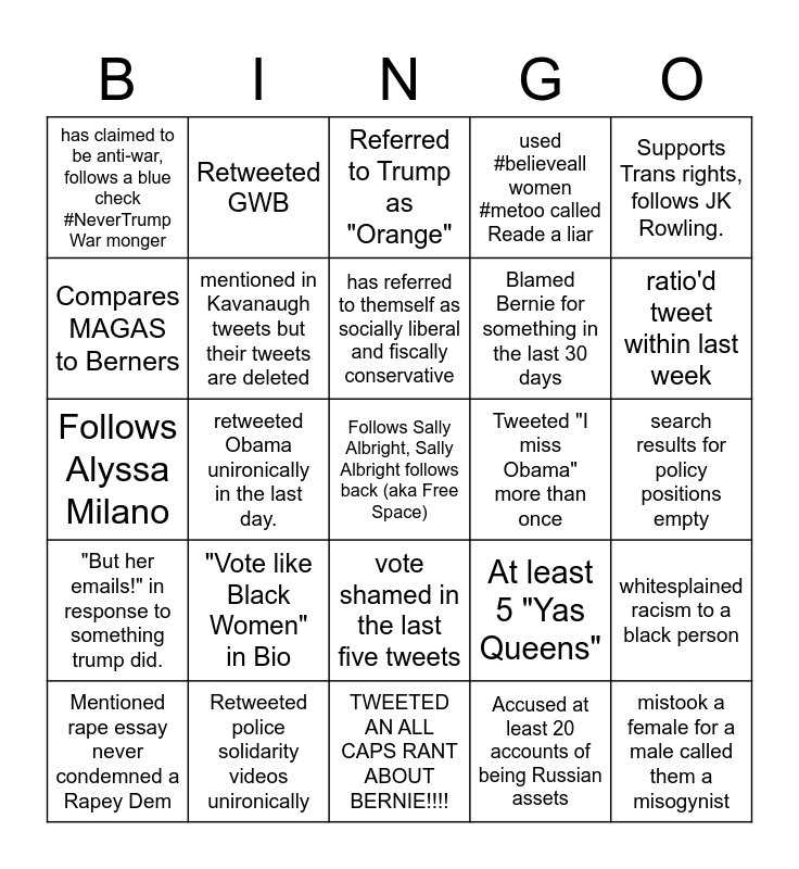 This bingo card has a free space and 24 words: "Vote like Black Women" in Bio, Retweeted police solidarity videos unironically, has referred to themself as socially liberal and fiscally conservative, Mentioned rape essay never condemned a Rapey Dem, Supports Trans rights, follows JK Rowling., has claimed to be anti-war, follows a blue check #NeverTrump War monger, Compares MAGAS to Berners, Retweeted GWB, Tweeted "I miss Obama" more than once, vote shamed in the last five tweets, Blamed Bernie for something in the last 30 days, Follows Alyssa Milano, At least 5 "Yas Queens", whitesplained racism to a black person, mentioned in Kavanaugh tweets but their tweets are deleted, Accused at least 20 accounts of being Russian assets, search results for policy positions empty, Referred to Trump as "Orange", ratio'd tweet within last week, retweeted Obama unironically in the last day., mistook a female for a male called them a misogynist, "But her emails!" in response to something trump did., used #believeall women #metoo called Reade a liar and TWEETED AN ALL CAPS RANT ABOUT BERNIE!!!!.