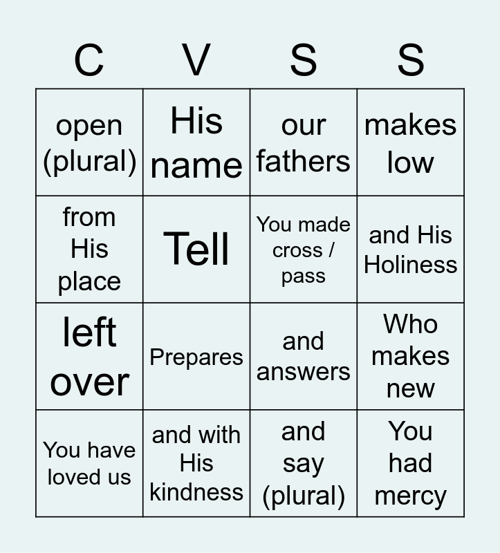 This bingo card has 96 words: Free!, Creator of light, and creator, and with His kindness, Makes new, Your doings / makings, With wisdom, You made, Your acquired, That is highest, That is lifted up, over us, Our Saviour, Prepares, Lights, Tell, and His Holiness, It shall be blessed, From on top, Your Hands, that You created, Our King, and our Redeeemer, Standing, in the Height, with fear, Strong ones, open (plural), Their mouths, and they bless, and they make King, to their Creator, His honour, and they say, from His place, they will say, sews, Makes grow (sprout), The wonders, Who makes new, with His kindness, Lights, You have loved us, Great mercy, You had mercy, our fathers, that had security (trusted) in You, and You taught them, You will favour us, and You will teach us, in our hearts, and to understand, and lighten up, our eyes, our hearts, and we will not be embarrassed, and we weill be happy, with your salvation, and bring us, from the four, corners, and lead us (Make us go), Standing upright, You have chosen, and bring us near, and strong, this matter, and His chair, and saves us, that he will listen, he will put, to Your Mitzvos, their fights, redeemed us, their first borns, You killed, You split, You made cross / pass, and they covered, left over, makes low, makes high, takes out, tied up people, poor people, and answers, to His people, in the time, to Him, and say (plural), all of them, shore of, He will be king, Like Your word, His name and the sea.