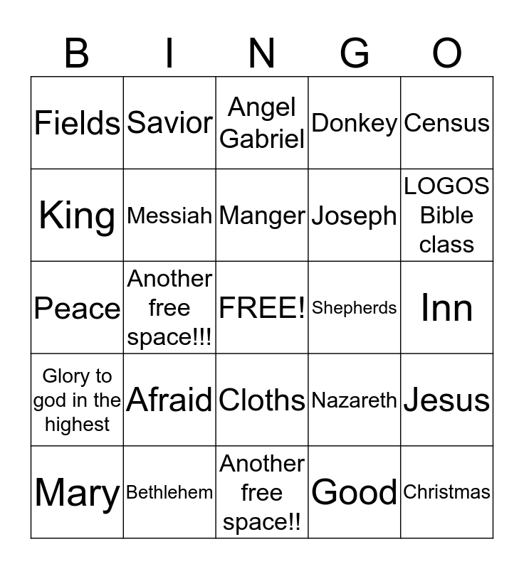 This bingo card has a free space and 24 words: Afraid, Bethlehem, Manger, Mary, Census, Fields, King, Savior, Shepherds, Cloths, Joseph, Peace, Nazareth, Jesus, Messiah, Good, Inn, Angel Gabriel, LOGOS Bible class, Another free space!!!, Christmas, Glory to god in the highest, Donkey and Another free space!!.