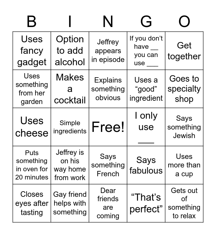 This bingo card has a free space and 24 words: Jeffrey is on his way home from work, Gay friend helps with something, Explains something obvious, Closes eyes after tasting, Get together, Uses fancy gadget, Uses something from her garden, Option to add alcohol, I only use ___, Says something French, Uses a “good” ingredient, Uses cheese, Says fabulous, Uses more than a cup, Makes a cocktail, “That’s perfect”, Says something Jewish, Jeffrey appears in episode, Goes to specialty shop, Simple ingredients, Gets out of something to relax, Puts something in oven for 20 minutes, If you don’t have __ you can use ___ and Dear friends are coming.